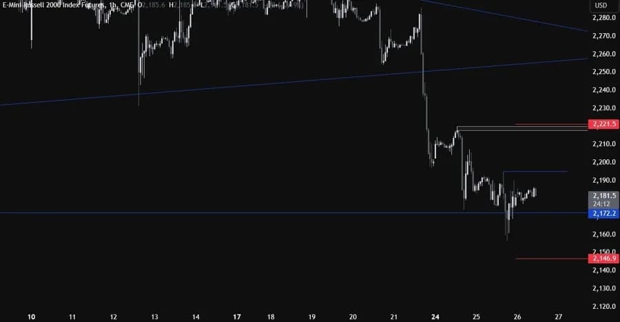 در نمودار روزانه، میبینیم که راسل ۲۰۰۰ زیر خط روند اصلی شکسته و کاهش را به کف ۲۱۷۲ ادامه داده است، زیرا فروشندگان بهطور تهاجمیتر وارد عمل شدهاند. در اینجا میتوان انتظار داشت که خریداران با ریسک مشخص زیر این کف وارد شوند تا برای بازگشت به مقاومت ۲۳۳۷ موقعیت بگیرند. از سوی دیگر، فروشندگان به دنبال شکست پایینتر برای افزایش شرطهای نزولی به سطح ۱۹۹۳ خواهند بود.