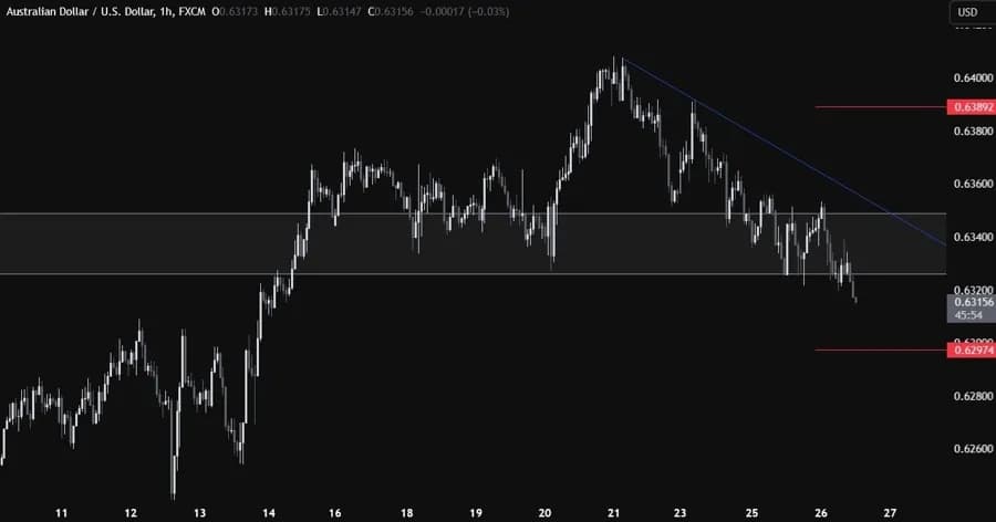 در نمودار روزانه، میبینیم که AUDUSD در حال سقوط به زیر منطقه حمایت کلیدی در سطح ۰.۶۳۳۰ است. اینجاست که میتوان انتظار داشت فروشندگان برای کاهش به سطح ۰.۶۲ وارد عمل شوند. از سوی دیگر، خریداران میخواهند قیمت به بالای این منطقه بازگردد تا هدف بعدی ۰.۶۵ را دنبال کنند.