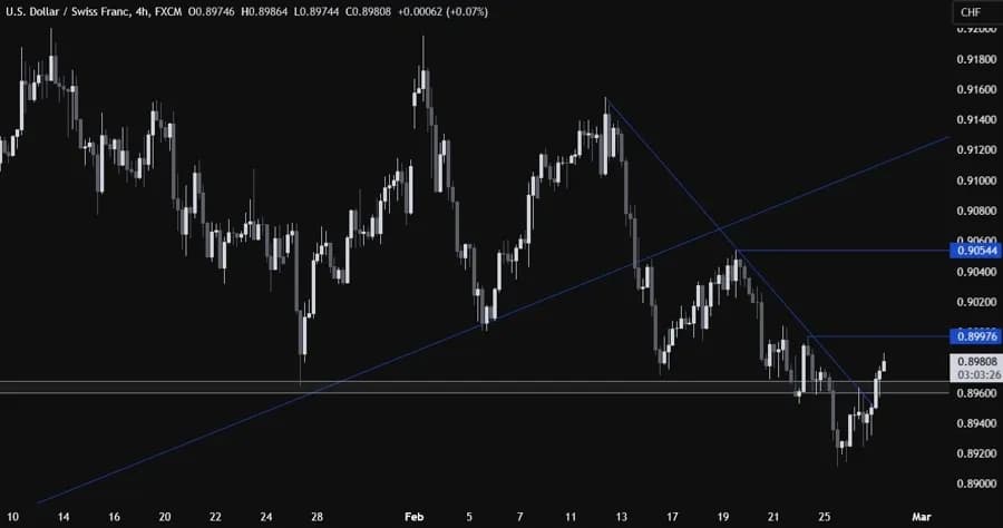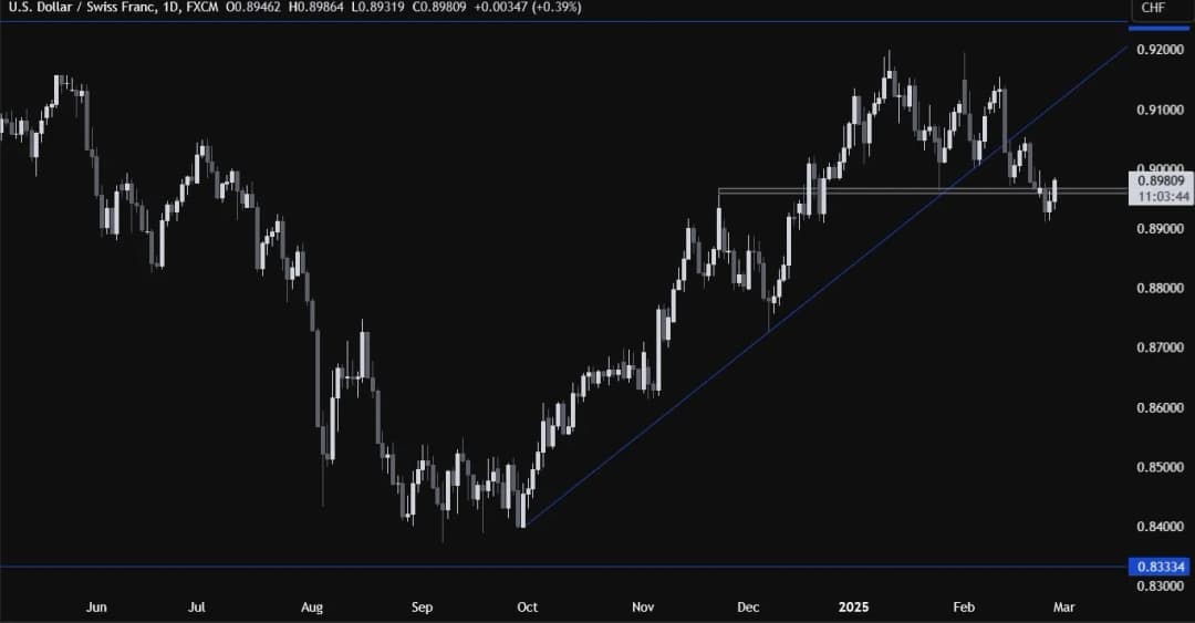 در نمودار روزانه، میبینیم که USDCHF اخیراً به زیر منطقه حمایت کلیدی ۰.۸۹۶۰ سقوط کرده است، اما اکنون قیمت در حال بازگشت به بالای آن است. اینجاست که میتوانیم انتظار داشته باشیم خریداران وارد عمل شوند تا برای یک صعود به سطح ۰.۹۲ موقعیت بگیرند. از سوی دیگر، فروشندگان میخواهند قیمت دوباره به زیر حمایت سقوط کند تا به فشار به سمت سطح ۰.۸۷ ادامه دهند.