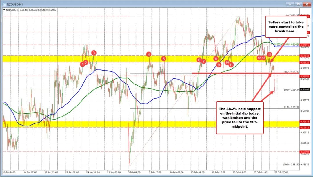 قیمت از آن زمان به نقطه میانی ۵۰٪ محدوده معاملاتی فوریه در ۰.۵۶۴۳۴ رسیده است. پایینترین قیمت روز به طور موقت به ۰.۵۶۴۱ کاهش یافت که چند پیپ زیر اصلاحی ۵۰٪ بود، اما شتاب نزولی متوقف شده و منجر به برخی تثبیتها در ۴۵ دقیقه گذشته شده است.