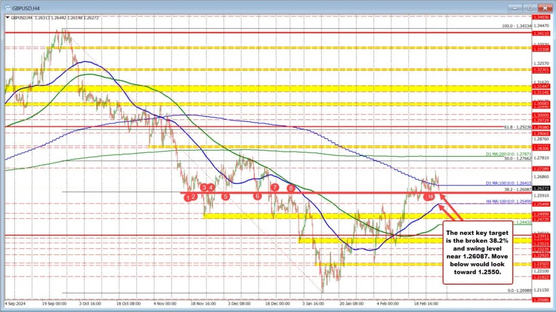 یک شکست قاطع زیر ۱.۲۶۰۸ و سپس به سمت سطح روانی ۱.۲۶۰۰ میتواند فشار فروش را تشدید کند. حمایت اصلی بعدی که باید زیر نظر داشت، میانگین متحرک ۱۰۰ کندلی در نمودار ۴ ساعته در ۱.۲۵۵۰ است.