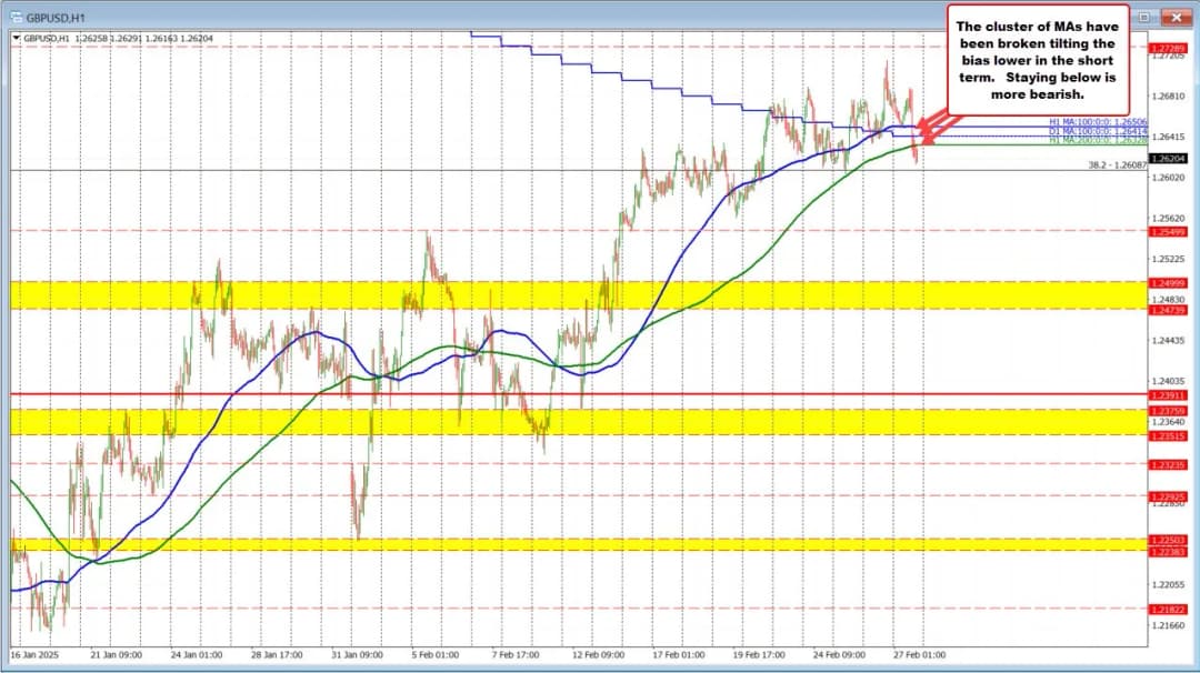 جفت ارز GBPUSD در حال کاهش است و یک دسته از میانگینهای متحرک کلیدی را شکسته و تغییر در احساسات بازار را نشان میدهد (نمودار ساعتی بالا را ببینید). این شکست باعث شده قیمت به زیر موارد زیر برود: