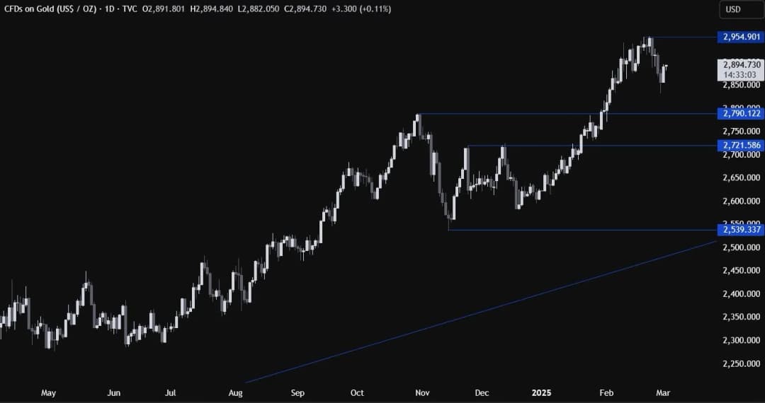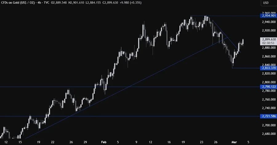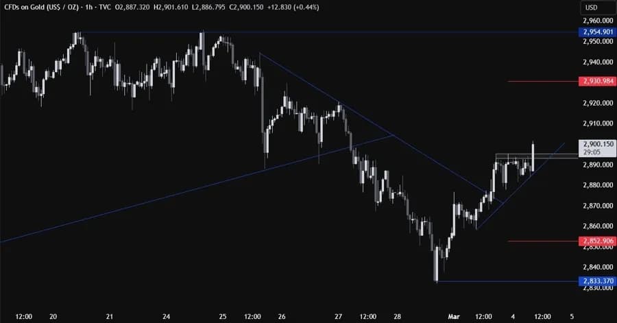در نمودار روزانه، میبینیم که طلا در روز جمعه گذشته در سطح ۲۸۳۲ نوسان کرد و با ترس از تعرفههای جدید به سطح ۲۹۰۰ بازگشت. در این بازه زمانی چیز زیادی برای مشاهده وجود ندارد، بنابراین باید به نمودارهای کوچکتر برویم تا جزئیات بیشتری ببینیم.