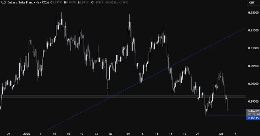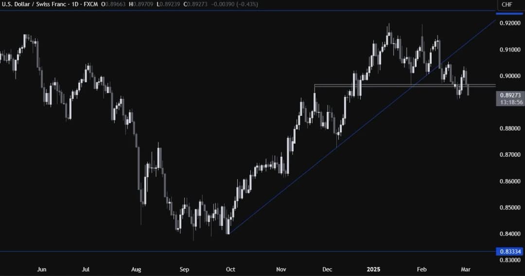 در نمودار روزانه، میبینیم که USDCHF بار دیگر به زیر منطقه حمایت کلیدی ۰.۸۹۶۰ شکسته است که به دلیل ترسهای جدید از تعرفهها رخ داده است. فروشندگان در این شکست تجمع کرده و کاهش را به سطح ۰.۸۷ ادامه دادهاند. خریداران، از سوی دیگر، میخواهند قیمت به بالای سطح ۰.۸۹۶۰ بازگردد تا اهداف صعودی جدید را دنبال کنند.