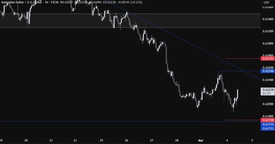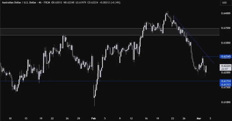 در نمودار ۴ ساعته، مشاهده میشود که یک خط روند نزولی، حرکت نزولی را تعریف میکند. فروشندگان احتمالاً به این خط روند تکیه خواهند کرد تا به فشار برای رسیدن به کفهای جدید ادامه دهند، در حالی که خریداران به دنبال شکست بالای خط روند و سطح ۰.۶۲۵۴ خواهند بود تا اعتماد به نفس خود را بازیابند و برای بازگشت به سطوح بالاتر موقعیتگیری کنند.