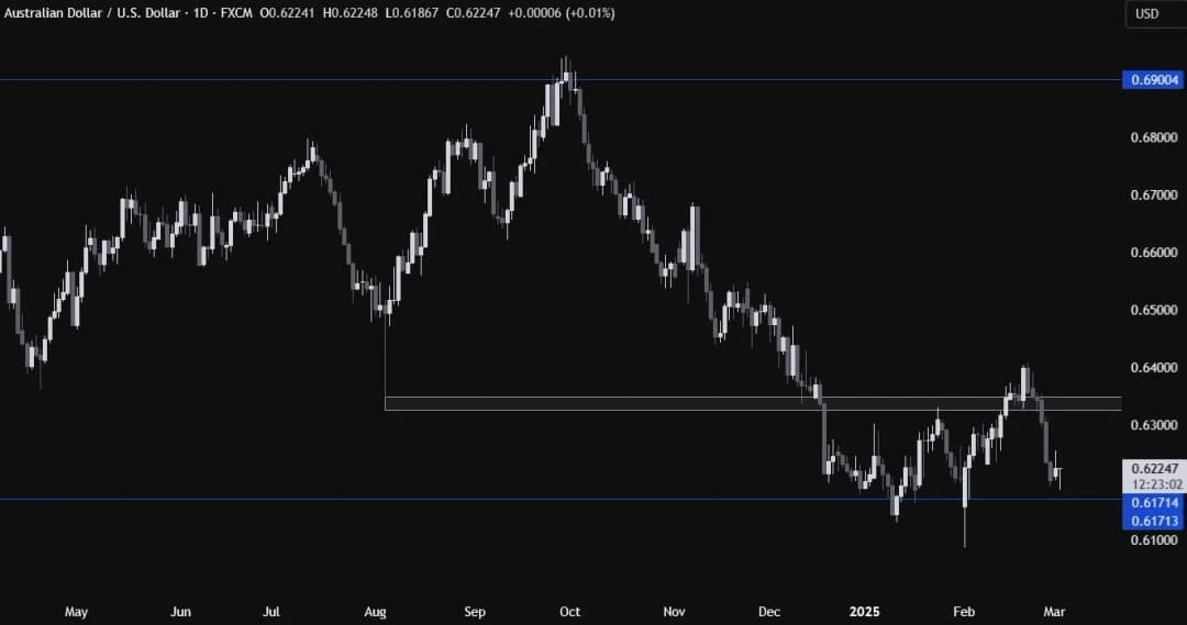 در نمودار روزانه، مشاهده میشود که AUDUSD به طور کامل به پایینترین سطح سالانه خود سقوط کرده است. در اینجا میتوان انتظار داشت که خریداران وارد عمل شوند و برای بازگشت به سطوح بالاتر موقعیتگیری کنند. از سوی دیگر، فروشندگان میخواهند قیمت زیر سطح ۰.۶۱۷۰ شکسته شود تا شرطهای نزولی برای رسیدن به کفهای جدید افزایش یابد.