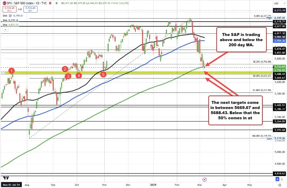 شاخص S&P 500 دیروز برای اولین بار از ۱ نوامبر ۲۰۲۳ به زیر میانگین متحرک ۲۰۰ روزه خود سقوط کرد. این سطح کلیدی در حال حاضر در ۵۷۳۲.۹۱ قرار دارد. در حالی که شاخص در طول روز معاملاتی زیر این سطح بود، توانست در پایان روز کمی بالاتر از آن در ۵۷۳۸.۵۲ بسته شود و از یک شکست قطعی جلوگیری کند.