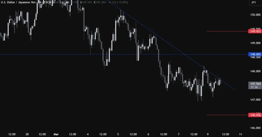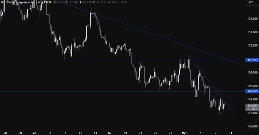 در نمودار روزانه، میبینیم که USDJPY زیر سطح کلیدی ۱۴۸.۶۰ معامله میشود. از نظر مدیریت ریسک، فروشندگان در سطح ۱۴۸.۶۰ موقعیت بهتری برای ریسک به پاداش دارند تا برای کاهش بیشتر قیمت آماده شوند، در حالی که خریداران نیاز دارند قیمت بالاتر برود تا به روند صعودی بازگردند.