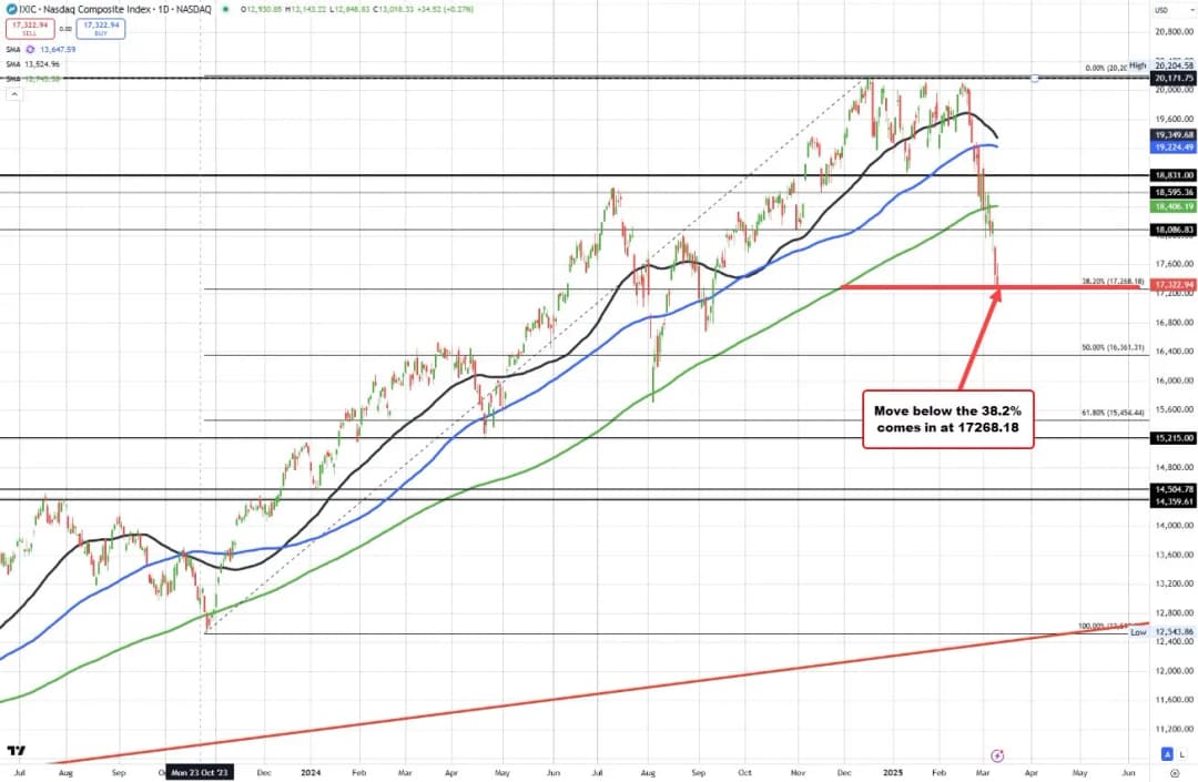 شاخص NASDAQ دوباره کاهش یافته و در حال آزمایش پایینترین قیمت روز گذشته و سطح اصلاحی ۳۸.۲ درصدی حرکت صعودی از پایینترین سطح اکتبر ۲۰۲۳ (آخرین باری که قیمت زیر میانگین متحرک ۲۰۰ روزه بود) است. این سطح اصلاحی در ۱۷۲۶۸.۱۸ قرار دارد. پایینترین قیمت امروز تاکنون به ۱۷۲۹۸.۹۴ رسیده است.