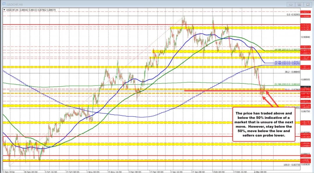 در نمودار ۴ ساعته، قیمت در این هفته - و در پایان هفته گذشته - بالاتر و پایینتر از ۵۰٪ حرکت صعودی از کف سپتامبر ۲۰۲۴ در ۰.۸۷۸۶۸ معامله شده است. این نشان میدهد که خریداران و فروشندگان در حال نبرد هستند و از جهت حرکت مطمئن نیستند. معاملهگران به دنبال حرکت بعدی با شتاب هستند.