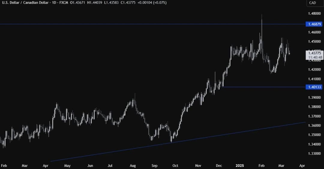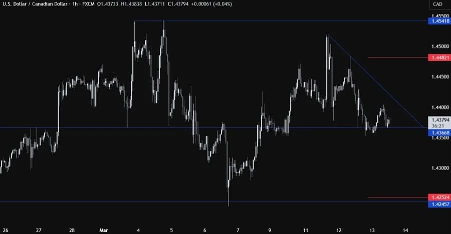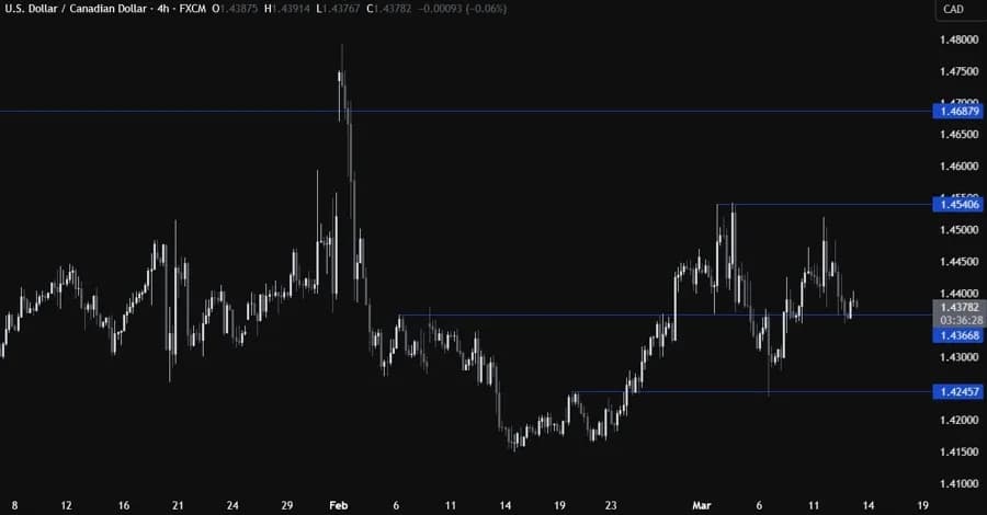 در نمودار روزانه، میبینیم که USDCAD همچنان بیشتر بین سطوح ۱.۴۲ و ۱.۴۵ در حال نوسان است، زیرا عدم قطعیت پیرامون تعرفهها بالا باقی مانده است. از این بازه زمانی چیز زیادی نمیتوانیم بفهمیم، بنابراین باید زوم کنیم تا جزئیات بیشتری را ببینیم.