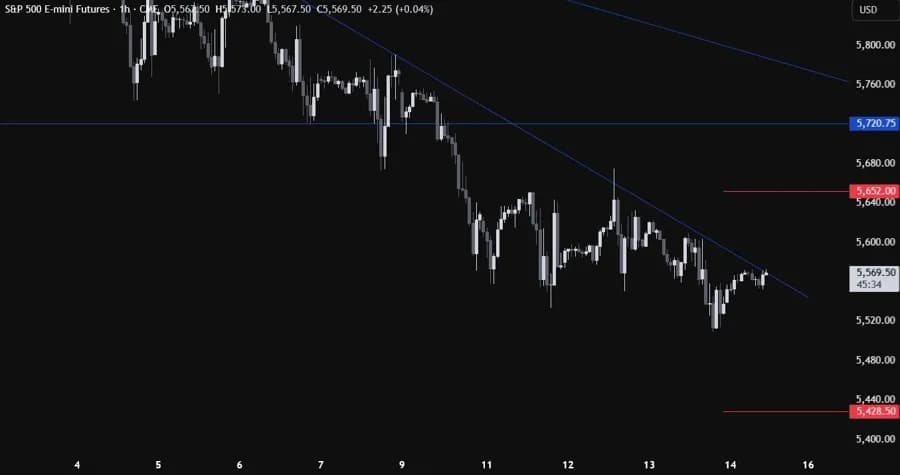 در نمودار ۴ ساعته، میبینیم که یک خط روند نزولی، شتاب نزولی را تعریف میکند. اینجاست که میتوان انتظار داشت فروشندگان با ریسک مشخصی بالای خط روند وارد شوند و برای کاهش بیشتر موقعیت بگیرند. خریداران، از سوی دیگر، به دنبال شکست صعودی خواهند بود تا خط روند بعدی را در سطح ۵۷۲۰ هدف قرار دهند.