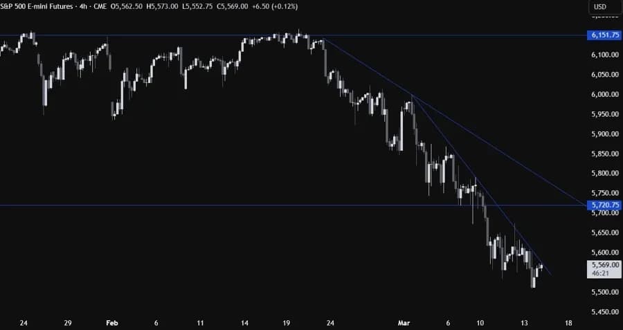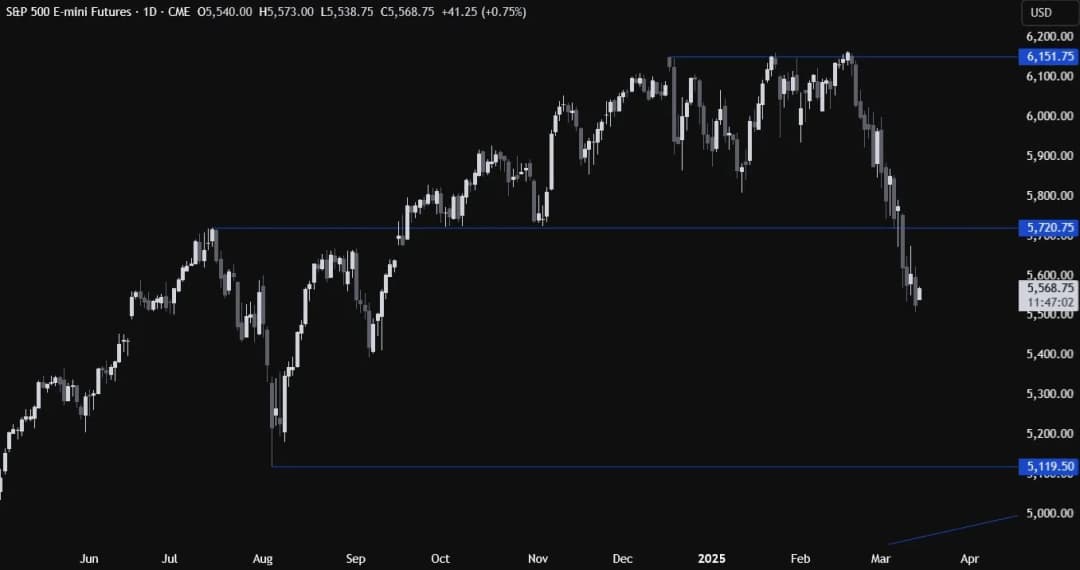 در نمودار روزانه، میبینیم که S&P 500 به زیر سطح کلیدی ۵۷۲۰ سقوط کرده و کاهش را به سطح ۵۵۰۰ ادامه داده است. از دیدگاه مدیریت ریسک، فروشندگان در سطح ۵۷۲۰ موقعیت بهتری برای نسبت ریسک به پاداش خواهند داشت، جایی که میتوانند با ریسک مشخصی بالای این سطح وارد شوند و برای کاهش به سطح ۵۴۰۰ موقعیت بگیرند. خریداران، از سوی دیگر، میخواهند قیمت بالاتر از سطح ۵۷۲۰ شکسته شود تا اطمینان بیشتری پیدا کنند و برای صعود به اوجهای تاریخی دوباره وارد شوند.
