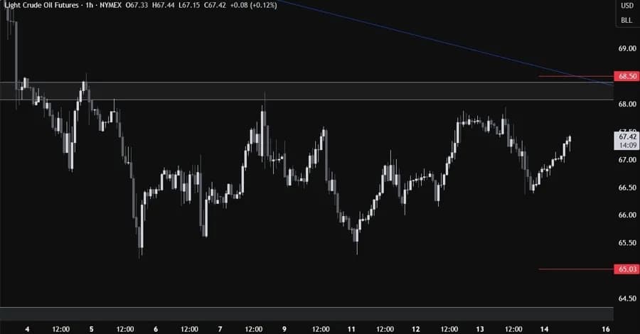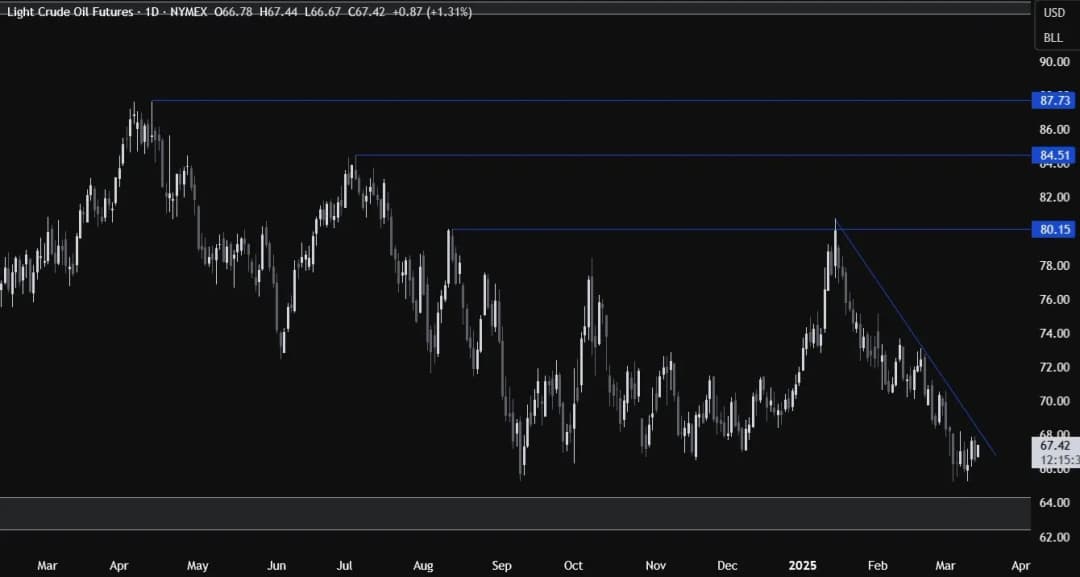 در نمودار روزانه، میبینیم که نفت خام به پایینترین سطح سپتامبر ۲۰۲۴ بازگشته است. ما یک خط روند نزولی داریم که شتاب نزولی را تعریف میکند. فروشندگان احتمالاً به این خط روند تکیه میکنند تا برای کاهش به منطقه حمایت کلیدی ۶۳ آماده شوند و به دنبال شکست زیر آن باشند. از سوی دیگر، خریداران میخواهند قیمت بالاتر برود تا برای بازگشت به سطح ۸۰.۰۰ آماده شوند.