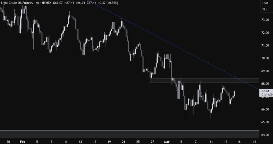 در نمودار ۴ ساعته، میبینیم که یک منطقه مقاومت قوی در حدود سطح ۶۸.۰۰ وجود دارد که با خط روند همگرا است. اینجاست که فروشندگان احتمالاً با ریسک مشخص بالای خط روند وارد عمل میشوند تا برای پایینترین سطح جدید آماده شوند. از سوی دیگر، خریداران به دنبال شکست بالاتر هستند تا کنترل را به دست بگیرند و برای افزایش به سطح ۸۰.۰۰ هدفگذاری کنند.