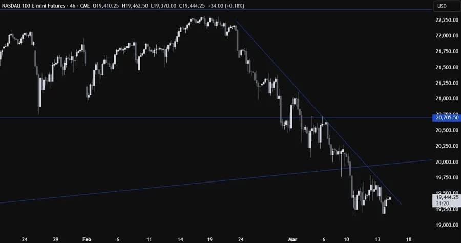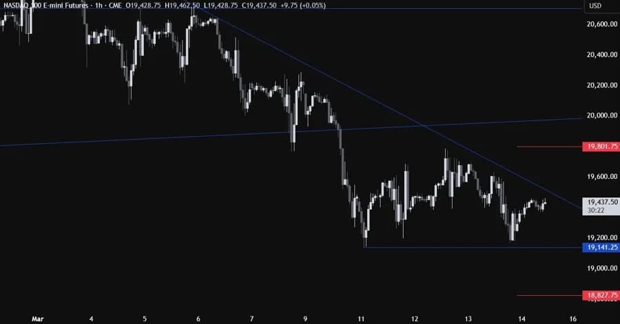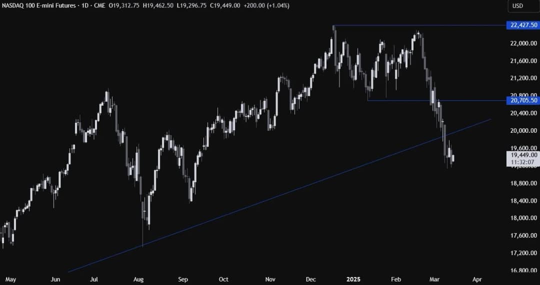در نمودار روزانه، میبینیم که نزدک به زیر خط روند اصلی سقوط کرده است که ظاهر خوبی ندارد، زیرا هیچ حمایت تکنیکالی تا سطح ۱۸۴۰۰ وجود ندارد. از دیدگاه مدیریت ریسک، فروشندگان در اطراف خط روند شکسته، موقعیت بهتری برای نسبت ریسک به پاداش خواهند داشت، جایی که میتوانند با ریسک مشخصی بالای خط روند، برای کاهش به سطح ۱۸۴۰۰ هدفگذاری کنند. از سوی دیگر، خریداران میخواهند قیمت دوباره بالای خط روند افزایش یابد تا اطمینان بیشتری پیدا کنند و برای صعود به اوجهای جدید تاریخی وارد عمل شوند.
