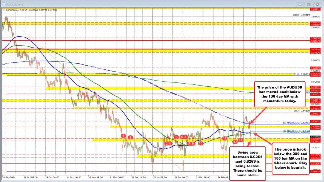 به طور مشخص، AUDUSD با حرکت قوی به زیر میانگین متحرک ۱۰۰ روزه بازگشته است که نشاندهنده فشار نزولی جدید است. این جفت ارز همچنین زیر میانگین متحرک ۱۰۰ و ۲۰۰ کندل در نمودار ۴ ساعته معامله میشود که باقیماندن قیمت زیر این سطوح، تمایل نزولی را تقویت میکند. میانگین متحرک ۲۰۰ کندل در ۰.۶۳۰۲۸ و میانگین متحرک ۱۰۰ کندل در ۰.۶۲۹۶۹ شکسته شدهاند.