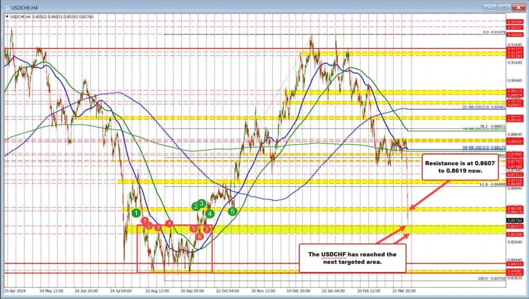 حرکت قیمت اکنون USDCHF را به کفهای جدید ۰.۸۵۵۵ رسانده است. قیمت کمی بالاتر از این کفها قرار دارد و فروش در حال شدت گرفتن است. حرکت امروز باعث شده USDCHF به کاهش ۲.۸۶٪ برسد که بزرگترین حرکت در میان ارزهای اصلی در برابر دلار آمریکا است.