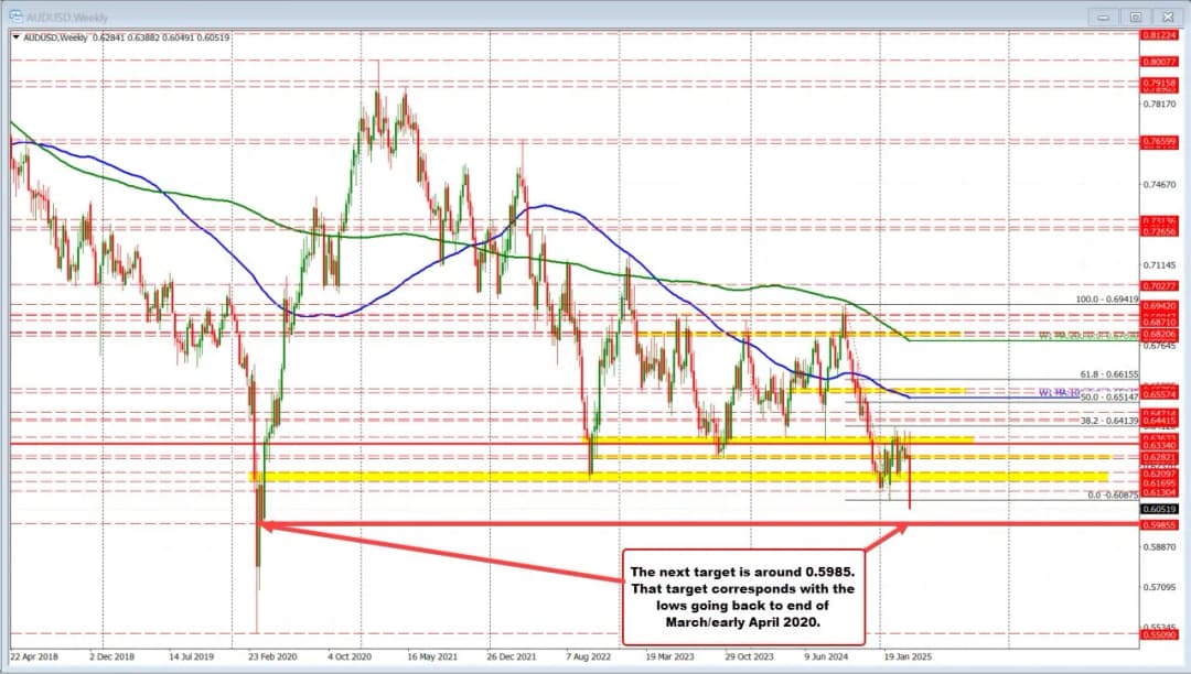 با نگاهی به تصویر کلی در نمودار هفتگی، پایینترین قیمت امروز، AUDUSD را به پایینترین سطح خود از دوران همهگیری در آوریل ۲۰۲۰ میبرد. هدف اصلی بعدی در حدود ۰.۵۹۸۵ ظاهر میشود که با کفهای نوسانی از هفتههای ۲۹ مارس و ۵ آوریل ۲۰۲۰ مطابقت دارد.