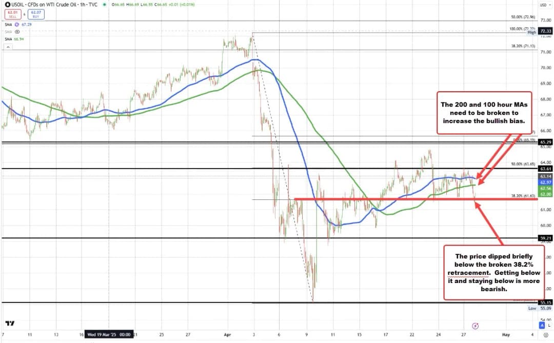 از نظر تکنیکالی، قیمت امروز پایینتر از سطح شکسته شده 38.2% در 61.63 دلار رفت، اما از آن سطح برگشت. صبح امروز قیمت به زیر میانگین متحرک 200 ساعته در 62.56 دلار سقوط کرد که راه را برای فروش بیشتر باز کرد. برای تغییر جهت فنی، قیمت باید بالای این سطح و میانگین متحرک 100 ساعته در 62.97 دلار تثبیت شود. تا آن زمان، فروشندگان دست بالاتر را دارند و شکست سطح 38.2% مانع بعدی خواهد بود.