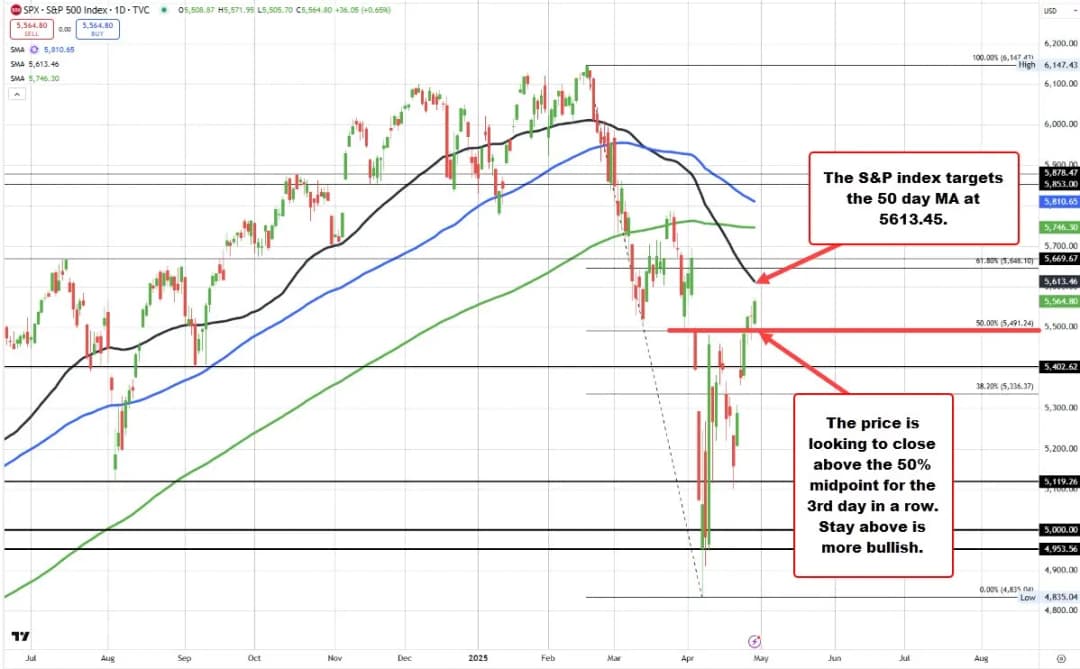 برای شاخص S&P، در سه روز معاملاتی گذشته هر روز بالای سطح اصلاحی 50 درصد بسته شده است. این سطح در 5,491.24 قرار دارد. هدف بعدی میانگین متحرک 50 روزه نزولی است که اکنون روی 5,613.48 قرار گرفته است. بالاترین قیمت امروز به 5,571.95 رسید.