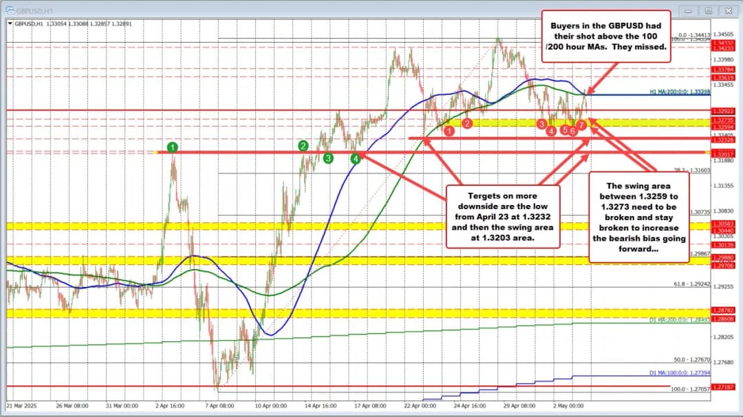خریداران GBPUSD فرصت بازپسگیری کنترل را با عبور از میانگینهای متحرک 100 و 200 ساعته همگرا (در نرخ 1.33238) داشتند، اما مومنتوم متوقف شد و قیمت مجدداً کاهش یافت.