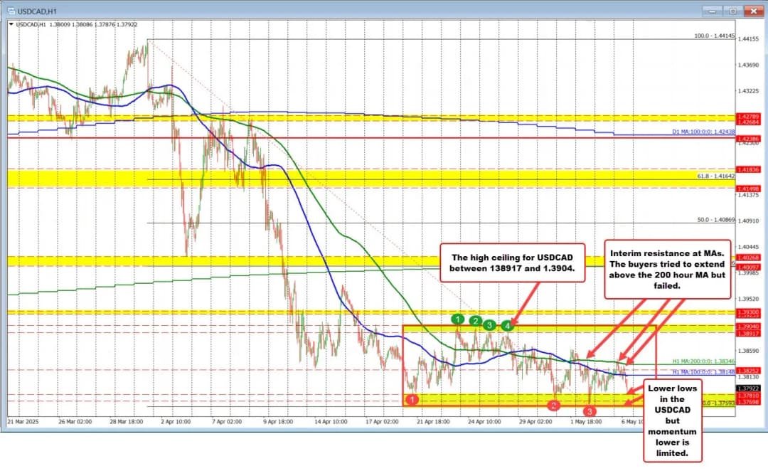 USDCAD فشار نزولی دارد اما شتاب کافی ندارد؛ سقفهای کلیدی و میانگینهای متحرک رشد را محدود میکنند