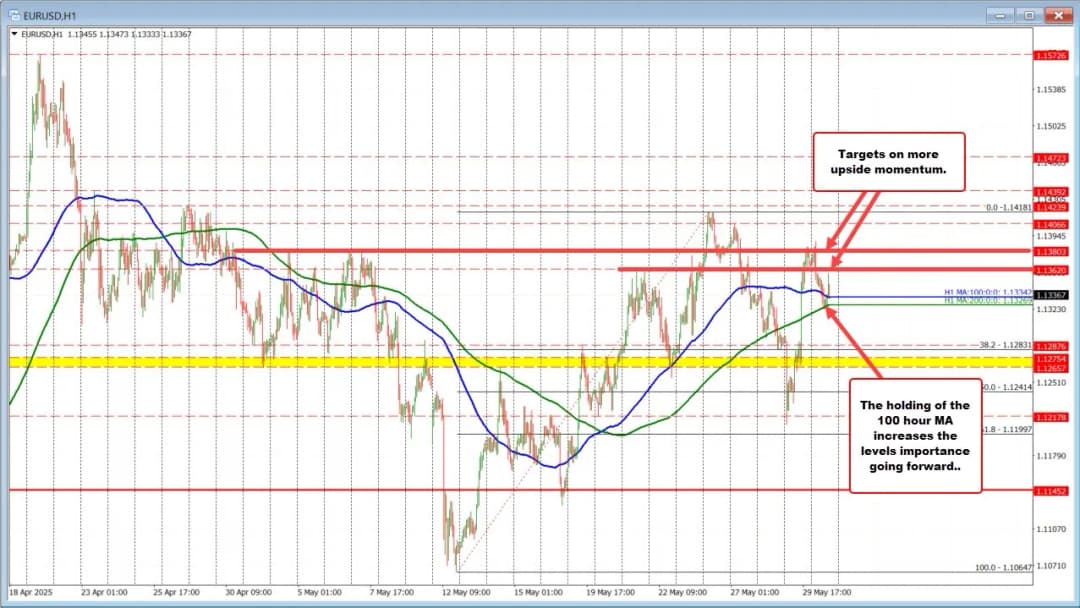 جفت ارز یورو/دلار آمریکا بالاتر از میانگین متحرک ۱۰۰ ساعته در سطح ۱.۱۳۳۴۲ حرکت کرد و تا ۱.۱۳۵۷ صعود داشت. اهداف بعدی در ۱.۱۳۶۲ و ۱.۱۳۸۰۳ قرار دارند. سقف امروز تا ۱.۱۳۸۹ بالا رفت.