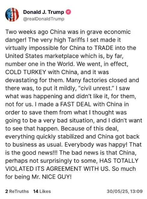 اما توئیت رئیسجمهور ترامپ مبنی بر نقض توافق تجاری توسط چین چندان خوشایند نبود:
