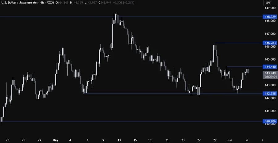 در نمودار ۴ ساعته میبینیم قیمت به ناحیه اوج swing اخیر در ۱۴۴٫۴۴ واکنش نشان داده و فروشندگان وارد شدند تا شکست زیر ۱۴۲٫۳۵ را هدف بگیرند. خریداران برای باز کردن مسیر رالی تا ۱۴۶٫۲۸ نیاز دارند قیمت بالاتر از این ناحیه بسته شود.