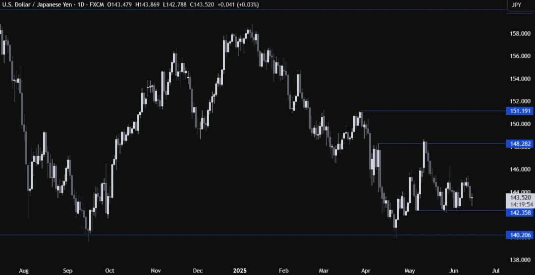 در نمودار روزانه، مشاهده میشود که جفت ارز USDJPY با توجه به دادههای اقتصادی ضعیف از آمریکا، به سمت سطح حمایتی ۱۴۲/۳۵ در حال عقبنشینی است. اگر قیمت به این حمایت برسد، احتمال ورود خریداران با مدیریت ریسک مشخص زیر سطح حمایت وجود دارد تا قیمت تا محدوده ۱۴۸/۲۸ صعود کند. در مقابل، فروشندگان در صورت شکست حمایت ۱۴۲/۳۵ میتوانند حرکت نزولی را تا سطح ۱۴۰ دنبال کنند.