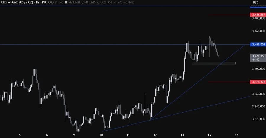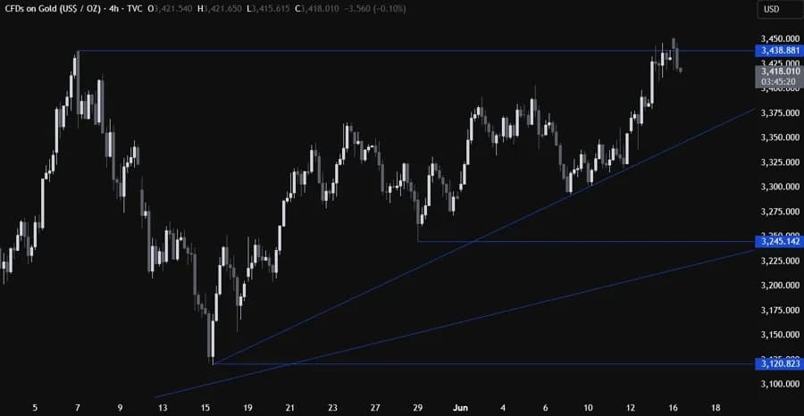 در نمودار روزانه، طلا نهایتاً به سطح کلیدی ۳۴۳۸ در اوج تنشهای خاورمیانه رسید. در این نقطه، فروشندگان وارد عمل شدند و با ریسک تعیینشده بالای این سطح به دنبال افت قیمت تا خط روند صعودی اصلی هستند. از طرف دیگر، خریداران باید شاهد عبور از این سطح باشند تا امید به رشد بیشتر و ثبت رکورد قیمتی جدید داشته باشند.