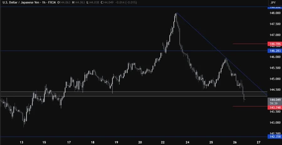 در نمودار یکساعته، حالا شاهد هستیم که روند نزولی، مومنتوم منفی را تعریف کرده است. اگر قیمت به این خط روند نزولی بازگردد، انتظار میرود فروشندگان با ریسک مشخص بالای این خط، برای شکست به زیر سطح ۱۴۴.۲۵ اقدام کنند و نسبت ریسک به بازده بهتری دریافت کنند. خریداران نیز در صورت شکست صعودی خط روند، انتظار افزایش فشار خرید به سمت اوجهای جدید را خواهند داشت. خطوط قرمز، محدوده نوسان متوسط روز را نشان میدهد.