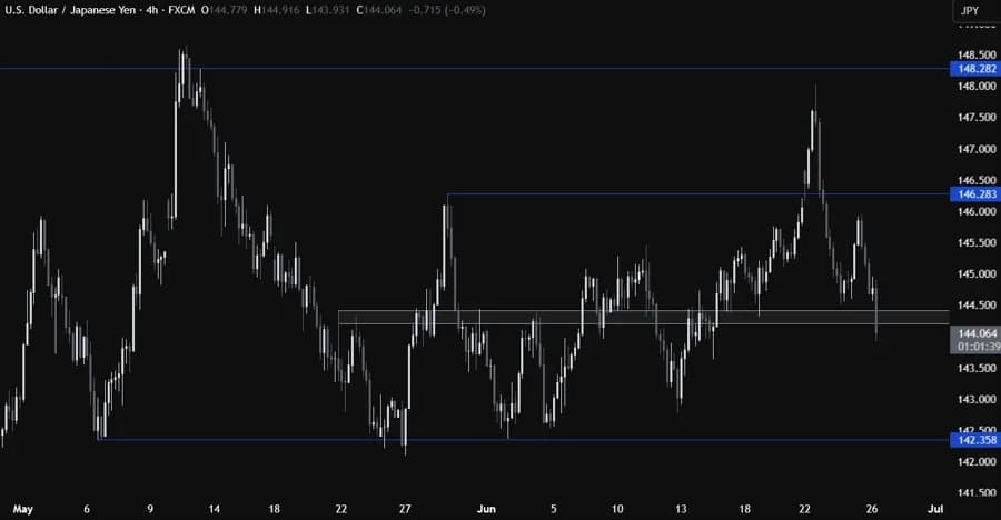 در چارت روزانه مشاهده میکنیم که جفتارز USDJPY به سمت کف محدوده اخیر در سطح ۱۴۲.۳۵ میل میکند. در این نقطه انتظار میرود خریداران با ریسک مشخص زیر این سطح وارد بازار شوند تا برای رشد دوباره به سمت مقاومت ۱۴۸.۲۸ موقعیتگیری کنند. در مقابل، فروشندگان منتظر شکسته شدن این سطح هستند تا فشار فروش را بر روی سطح بعدی یعنی ۱۴۰.۰۰ افزایش دهند.