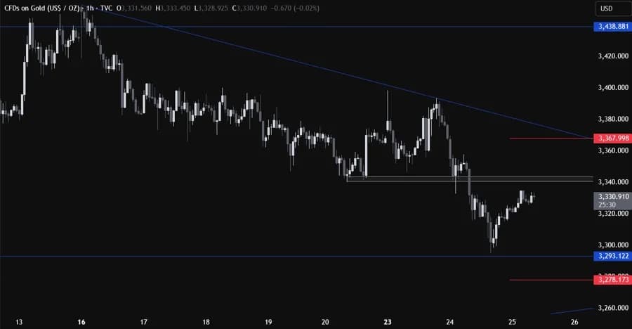 در نمودار یک ساعته، یک محدوده مقاومت جزئی در سطح ۳۳۴۰ دیده میشود. در این ناحیه انتظار داریم فروشندگان با تعیین حد ضرر بالای این سطح وارد شده و برای کاهش قیمت به خط روند اصلی اقدام به فروش کنند. در مقابل، خریداران منتظر شکست این مقاومت هستند تا با افزایش موقعیتهای خرید، بازار را به سمت اوجهای جدید هدایت کنند. خطوط قرمز محدوده متوسط تغییرات روزانه امروز را نشان میدهد.