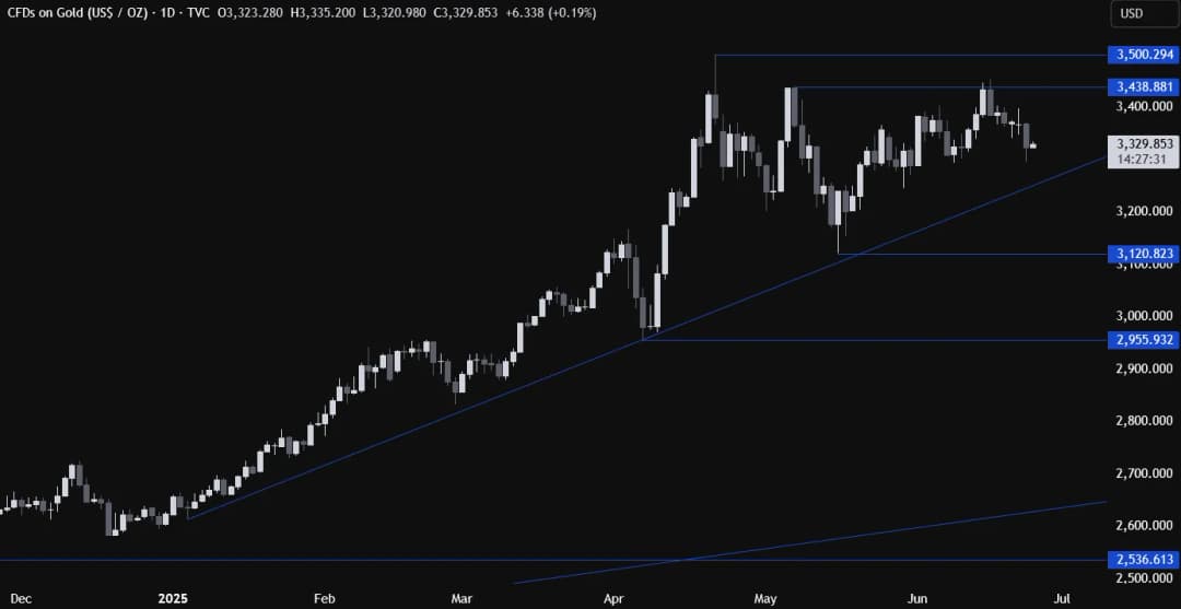 در نمودار روزانه مشاهده میشود که قیمت طلا به دلیل پایان درگیری میان اسرائیل و ایران و همچنین تمایل کلان به کاهش، به سمت خط روند اصلی کاهش یافته است. از منظر مدیریت ریسک، خریداران در محدوده خط روند ریسک به پاداش بهتری دارند تا برای رشد مجدد و ثبت اوج تاریخی جدید وارد موقعیت خرید شوند. فروشندگان نیز ترجیح میدهند قیمت پایینتر شکسته شود تا برای کاهش بیشتر قیمت تا سطح ۳۱۲۰ وارد موقعیت شوند.