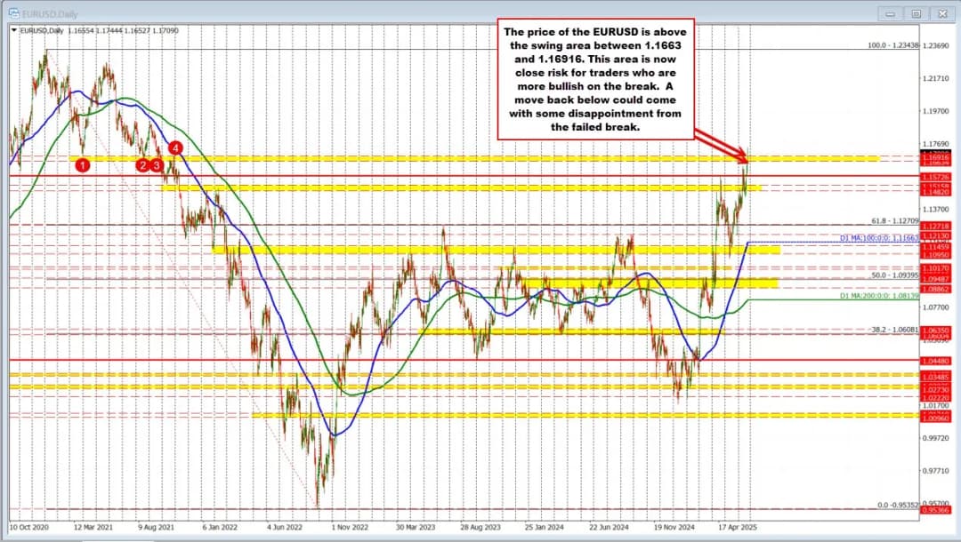 جفتارز یورو/دلار آمریکا (EURUSD) روند صعودی خود را ادامه داده و موفق به عبور از منطقه مهم ۱.۱۶۶۳ تا ۱.۱۶۹۱ شده است؛ منطقهای که بر اساس رفتار قیمت بین آوریل تا اکتبر ۲۰۲۱ تعریف شده بود. این شکست صعودی باعث شد این جفتارز به سقف روزانه ۱.۱۷۴۴ برسد که بالاترین سطح از سپتامبر ۲۰۲۱ تاکنون است.