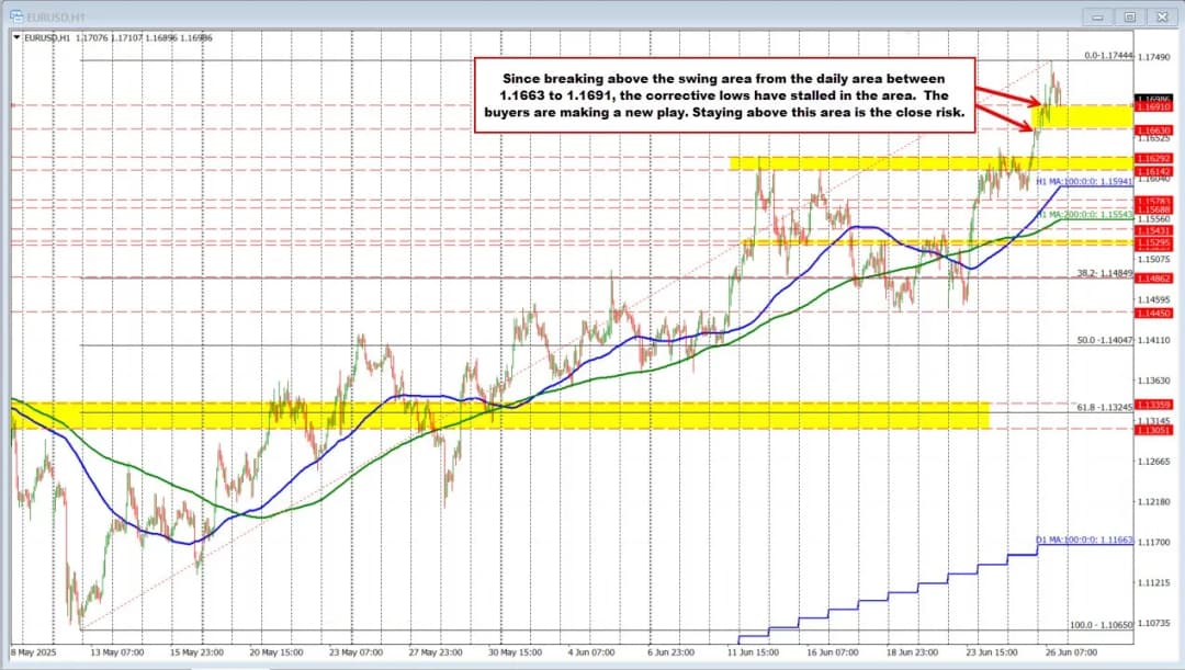 با بررسی نمودار ساعتی، دیده میشود که قیمت در بالای منطقه شکستهشده حمایت قدرتمندی ایجاد کرده است. هر بار که اصلاح کوتاهی پس از شکست صعودی رخ داده، قیمت بالای محدوده ۱.۱۶۶۳ تا ۱.۱۶۹۱ باقی مانده که نقش حمایتی این ناحیه را تأیید میکند. آخرین اصلاح قیمتی نیز تاکنون نزدیک به سطح ۱.۱۶۹۱ حفظ شده است؛ چیزی که سناریوی ایدهآل برای خریدارانی است که به دفاع از شکست و تداوم روند صعودی امید دارند.