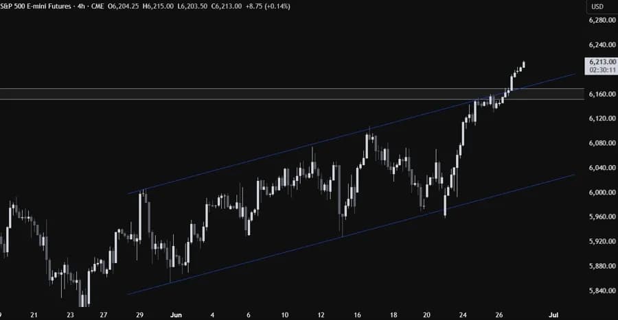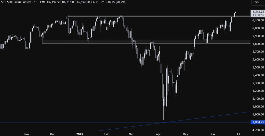 در نمودار روزانه، شاخص S&P 500 موفق شد رکورد تاریخی تازهای ثبت کند. خریداران با شکستن مقاومت قبلی، به طور تهاجمیتری وارد بازار شدند و روند صعودی را تقویت کردند. فروشندگان فعلاً فرصتی ندارند و تنها باید منتظر سقوط قیمت به زیر اوج قبلی در سطح ۶۱۵۰ باشند تا بتوانند به فروش در محدوده ۶۰۰۰ فکر کنند.