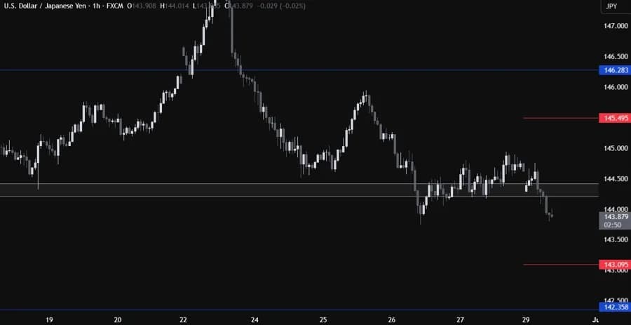 در نمودار یک ساعته شاهد روند خاص جدیدی نیستیم و احتمالاً بازار در همین سطوح به روند رنج ادامه خواهد داد. فروشندگان به دنبال فروش زیر محدوده ۱۴۴.۲۵ خواهند بود، در حالی که خریداران به دنبال ورود در بالای آن سطح هستند. خطوط قرمز، دامنه متوسط قیمت روزانه امروز را نشان میدهند.