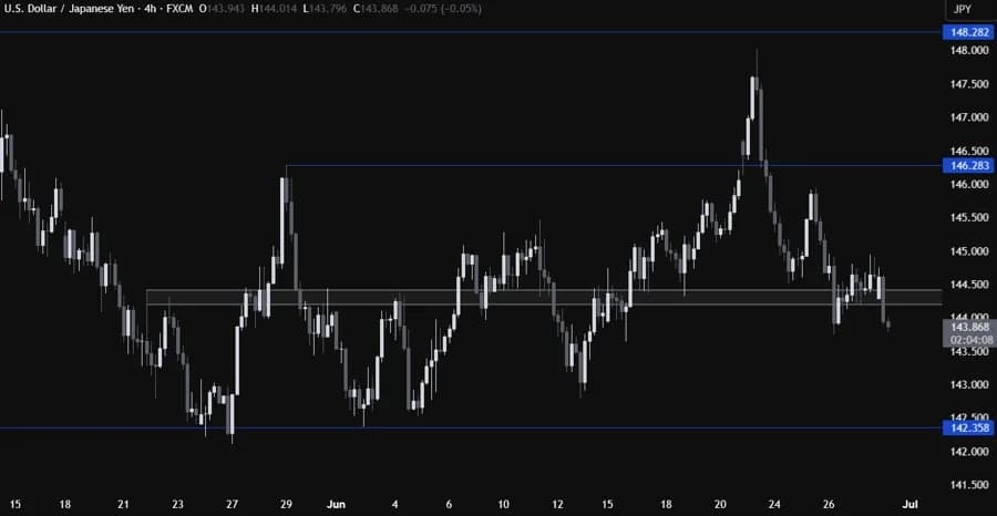 در نمودار چهار ساعته، شاهد نوعی تثبیت قیمت حوالی محدوده کلیدی ۱۴۴.۲۵ بودیم. پس از شکسته شدن این محدوده به سمت پایین، فروشندگان با قدرت بیشتری وارد شدند و قیمت را تا حمایت ۱۴۲.۳۵ کاهش دادند. اگر خریداران موفق شوند قیمت را به بالای این محدوده بازگردانند، هدف بعدی آنان سطح ۱۴۶.۲۸ خواهد بود.