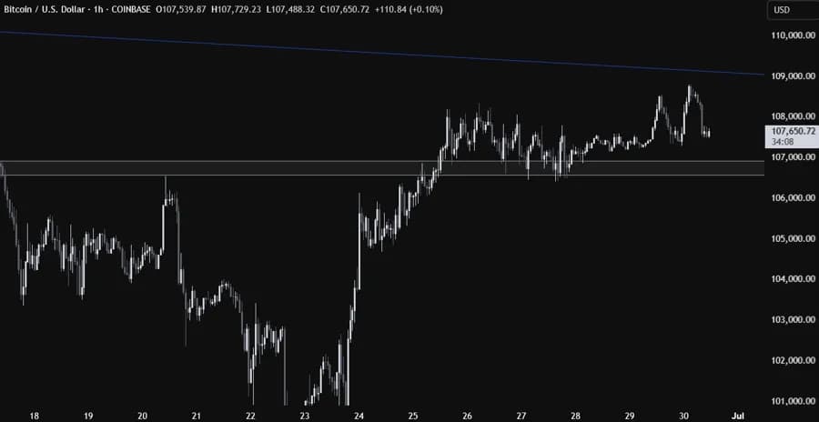 در نمودار یکساعته مشخص است که مومنتوم صعودی با رسیدن به محدوده بالایی پرچم کمی کاهش یافته است. منطقه حمایتی کلیدی حوالی ۱۰۷,۰۰۰ دلار قرار دارد؛ جایی که خریداران همچنان با ریسک محدود پایینتر از این سطح، وارد بازار میشوند تا قیمت را به سمت قلههای جدید هدایت کنند. فروشندگان نیز در انتظار عبور قیمت به سطوح پایینتر هستند تا شرطهای نزولی خود را تقویت کنند و قیمت را به سمت مرز پایینی پرچم در نزدیکی ۱۰۰,۰۰۰ دلار سوق دهند.