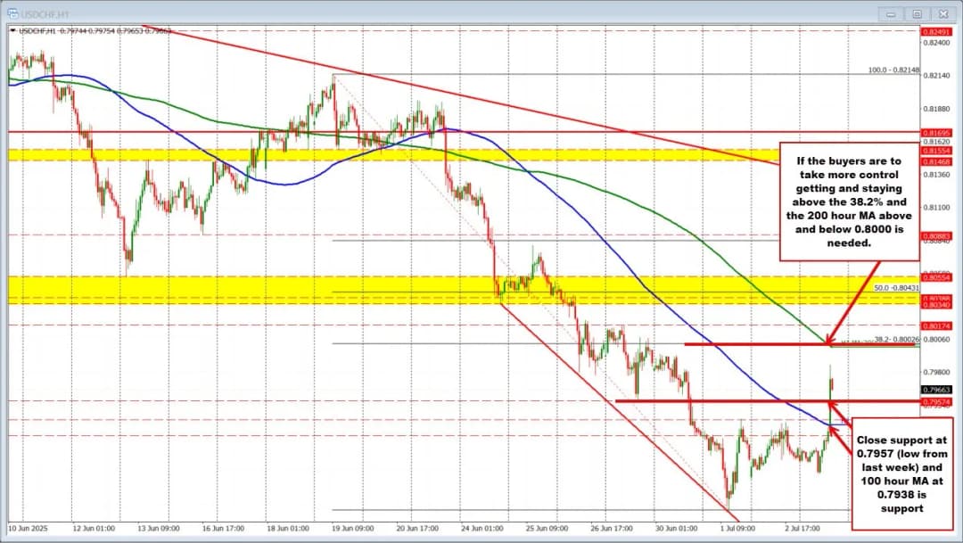 USDCHF: جفت ارز دلار/فرانک سوئیس نیز صعود کرد و از میانگین متحرک ۱۰۰ ساعته در ۰.۷۹۳۸ عبور کرد و از کف هفته گذشته در ۰.۷۹۵۷ گذشت که حالا به عنوان حمایت نزدیک برای خریداران عمل میکند. در بالا، مقاومت کلیدی در سطح اصلاح ۳۸.۲ درصدی ریزش از سقف ۱۹ ژوئن در ۰.۸۰۰۲ قرار دارد و میانگین متحرک ۲۰۰ ساعته کمی پایینتر در ۰.۷۹۹۹ است. عبور پایدار از سطح ۰.۸۰۰۰ سیگنال صعودی و نشانه کسب قدرت بیشتر خریداران خواهد بود.