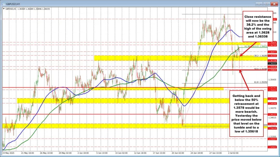 EURUSD: جفت ارز یورو/دلار آمریکا زیر میانگین متحرک ۱۰۰ ساعته یعنی سطح ۱.۱۷۶۸ شکسته شد و نشاندهنده تمایل نزولی بیشتر است، هرچند هنوز بالاتر از میانگین متحرک ۲۰۰ ساعته در سطح ۱.۱۶۰۷۵ قرار دارد و پایینترین سطح جلسه به ۱.۱۷۱۶۳ رسید. این جفت ارز همچنین پایینتر از کف دیروز (۱.۱۷۴۶) و سقف هفته گذشته (۱.۱۷۵۲۹) قرار گرفت که اکنون به عنوان مقاومتهای کوتاهمدت عمل میکنند. شکست امروز زیر میانگین ۱۰۰ ساعته، تمایل نزولی و برتری فروشندگان را تقویت کرده است.