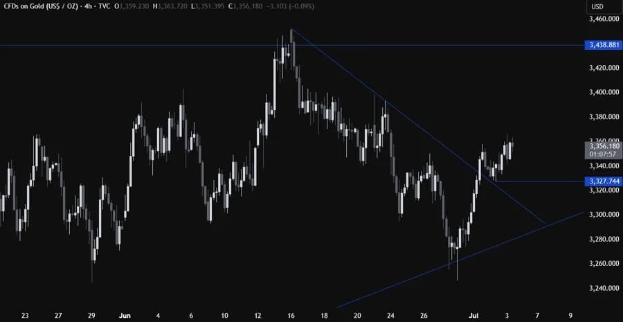 طلا پس از برخورد به یک خط روند اصلی و افزایش انتظارات بازار برای کاهش نرخ بهره توسط فدرال رزرو، به طور پیوسته در حال رشد بوده است. با این حال، با نزدیک شدن زمان انتشار گزارش اشتغال غیرکشاورزی آمریکا (NFP) و تعطیلات فردا در آمریکا، حرکت صعودی کمی کاهش یافته است.