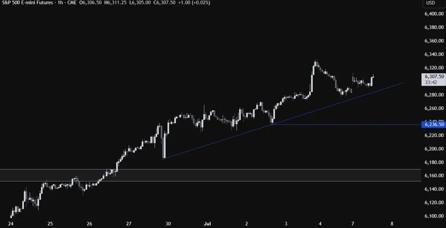 در نمودار یک ساعته نیز یک خط روند صعودی جزئیتر داریم که تکانه صعودی را در این تایمفریم نشان میدهد. خریداران احتمالاً همچنان به این خط روند اتکا میکنند تا شاخص را به سقفهای تازهتری برسانند، در حالی که فروشندگان برای اصلاح عمیقتر ابتدا محدوده ۶۲۳۶ و در صورت شکست مجدد سطح ۶۱۶۰ را هدف میگیرند.