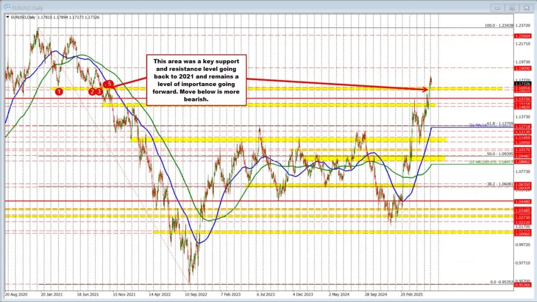قیمت دوباره به سمت میانگین متحرک ۲۰۰ ساعته بازگشته و فروشندگان بار دیگر جلوی حرکت صعودی را گرفتند. تا زمانی که این سطح شکسته نشود، روند نزولی حفظ میشود. اگر قیمت به زیر ۱.۱۷۱۸ برسد، امکان حرکت به سمت ناحیه ۱.۱۶۶۳ تا ۱.۱۶۹۱ وجود دارد. این محدوده که از سال ۲۰۲۱ تاکنون نقش حمایتی و مقاومتی ایفا کرده، اهمیت زیادی دارد (مطابق تصویر نمودار روزانه زیر). شکست این منطقه میتواند نشانه قدرت بیشتر فروشندگان و تداوم فشار نزولی باشد.