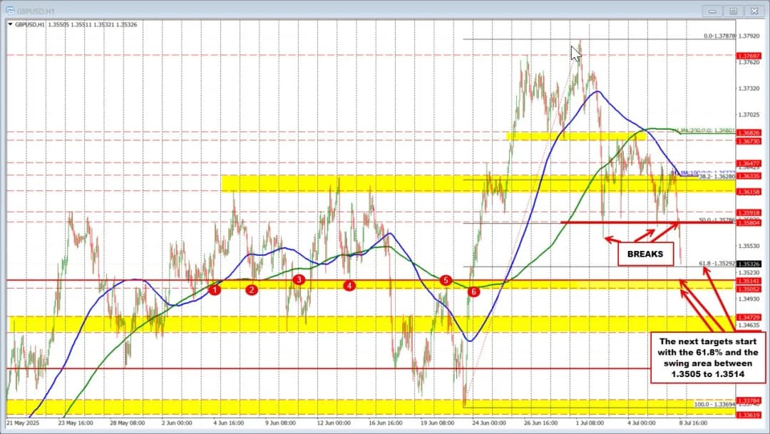 جفتارز پوند به دلار آمریکا (GBPUSD) همچنان به روند نزولی خود ادامه میدهد و اکنون به سمت هدف بعدی یعنی سطح اصلاحی ۶۱.۸ درصدی دامنه معاملات ماه ژوئن حرکت میکند. این سطح در قیمت ۱.۳۵۲۹۲ قرار دارد و در حال حاضر قیمت کمی بالاتر از این عدد، یعنی در ۱.۳۵۳۳ معامله میشود. اگر قیمت به زیر این سطح برسد، معاملهگران نگاهی به محدوده نوسانی بین ۱.۳۵۰۵ تا ۱.۳۵۱۴ خواهند داشت.