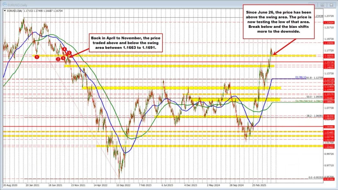 پس از شکست صعودی در ۲۶ ژوئن، قیمت به طور خوشایندی بالای این محدوده باقی مانده بود و حاکی از سلطه خریداران بود. با این حال، افت امروز این سناریو را به چالش کشیده و جفتارز دوباره به زیر لبه پایینی محدوده ۱.۱۶۶۳–۱.۱۶۹۱ بازگشته است. این موضوع میتواند نشانه ضعف و تغییر تمایل بازار باشد.