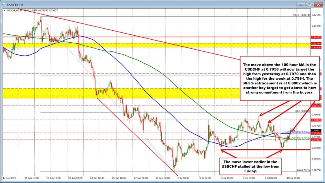 از منظر تکنیکال، USDCHF امروز موفق شد بار دیگر به بالای میانگین متحرک ۱۰۰ ساعته (خط آبی) در نرخ ۰.۷۹۵۶ و میانگین متحرک ۲۰۰ ساعته (خط سبز) در نرخ ۰.۷۹۴۳ بازگردد؛ سطوحی که دیروز به زیر آنها سقوط کرده بود. این بازگشت، اعتماد و کنترل بیشتری به خریداران میدهد.